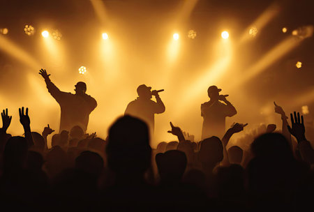 The image captures silhouettes of performers on a stage under warm spotlights. Their hands are raised, suggesting interaction with an unseen audience. The scene is dominated by a golden color palette and strong overhead lighting. It could be used to illustrate events, music performances, or entertainment features.