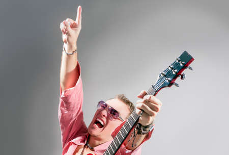 Music Concept: Portrait of Expressive Caucasian Male Guitarist Playing the Guitar and Shouting Loud with Passion. Lifted Hand with Point Finger. Against Gray Background. Horizontal Image Orientation