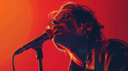 A rock singer sings on stage with a microphone. A singer with a microphone highlighted on a red background.