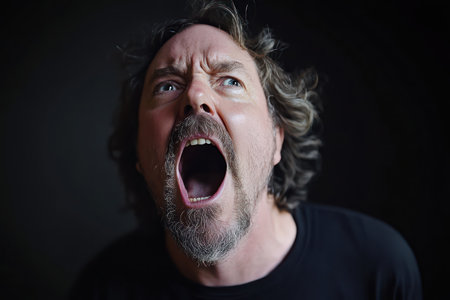 Expressive man screaming with wide open mouth, symbolizing rage, emotion, shock, or protest on a blank background.