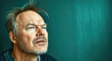 Contemplative Senior Man with Weathered Face Against Teal Background Reflecting on Life.