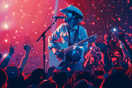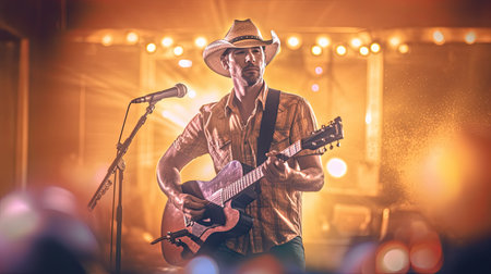Popular country music performer with a guitar on a big stage under spotlights