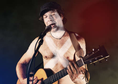 Musician singing and playing guitar at concert