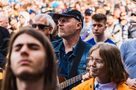Wroclaw, Poland - May 1 2023: Participants with guitars at open event Guitar Guinness World Record 2023 where record was beaten with 7967 guitars at market square