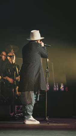 Nadym, RUSSIA-SEPTEMBER 03, 2021: Vocalist of the popular Russian pop-rock band Uma2rman Vladimir Kristovsky