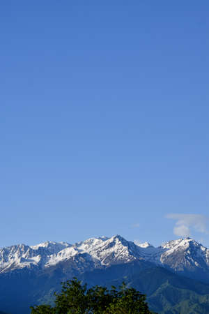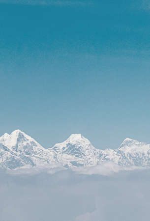 Foggy mountain range background with blue sky and white mist in the early morning sun. Snowy peaks of Himalayan mountains on the horizon in Nepal. Large copy-space on the top for your text.