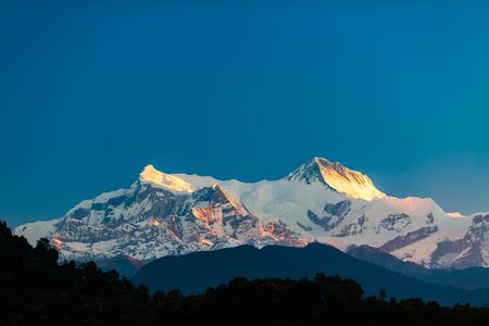 Mountain inspirational beautiful sunset landscape in Himalaya Mountains. IV7525m Himalayas Annapurna and Annapurna II7937m peaks over blue sky. Looking at mountains landscape view from Pokhara city, Nepal.