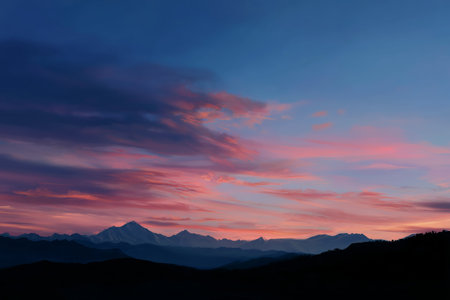 Majestic mountain landscape at sunset revealing vibrant hues of pink and blue sky with distant peaks