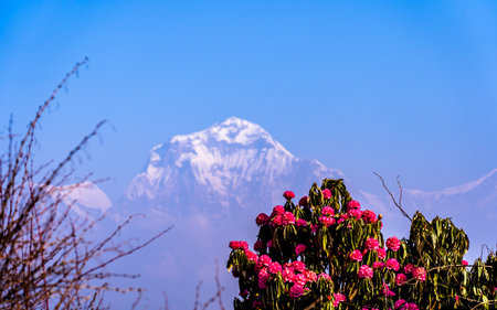 Rhododendron flowers and snow-capped peak of Mount Dhaulagiri, in Nepal.