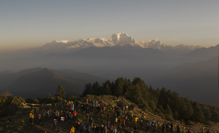 Annapurna, Nepal - November 14, 2018: Tourists meeting the dawn on Poon Hill (3210 m). It's the famous view point in Gorepani village in Annapurna conservation area, Nepal.