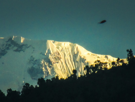 Trees and snowcapped peak at background in the Himalaya mountains, Nepal