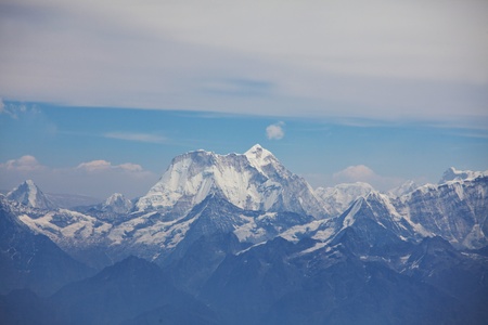 Amazing shot of the Himalayas mountain peaks covered with white snow attracts a lot of climbers and mountaineers.