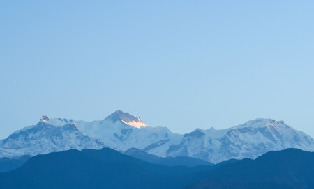 Mount kangchenjunga peak of Himalayan mountains at dawn. Snow clad white peaks under cloud cover as seen fro kalimpong india.