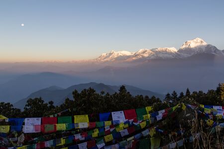 Sunrise and full moon with view of Dhaulagiri mountain from Poon Hill on the Annapurna Circuit.