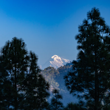 A view of the Trisul mountain peak on the Himalayan range framed with pine trees on either sides