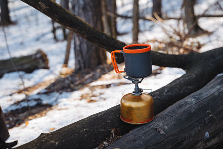 A steaming cup of coffee is placed carefully on a gas stove, which is situated on a sturdy log deep within the peaceful woods, surrounded by the beauty of nature and the sound of rustling leaves