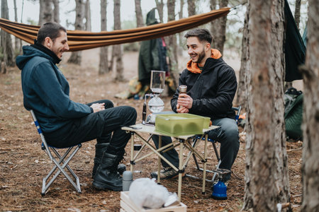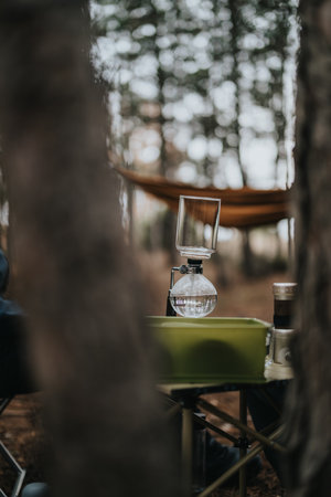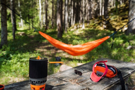 Camping Scene with Coffee Setup and Hammock in a Serene Forest
