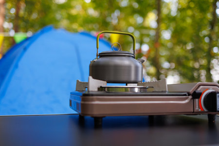 Camping Kettle standing on a gas tourist stove against the background of a tent in the forest