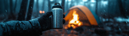 hands holding a cup with hot drink in the middle of a cold mountain generative ai