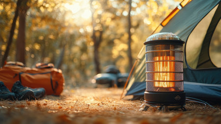 A cozy camping scene featuring a modern heater beside a tent in a tranquil forest setting during sunset, evoking warmth and adventure in nature.