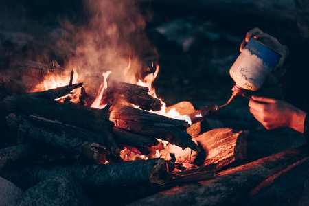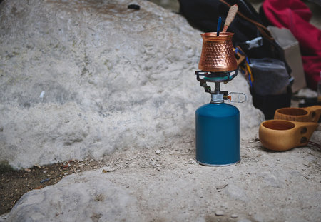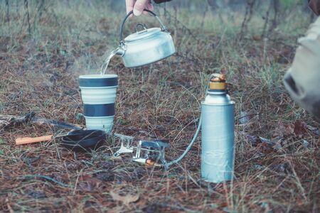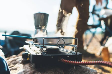 person cooking hot coffee in nature camping outdoor, cooker prepare breakfast picnic on metal gas stove, tourism recreation outside; campsite lifestyle