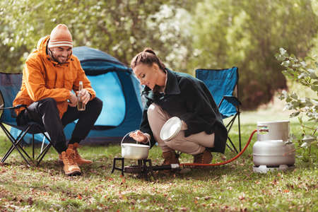 Cooking process in the camping in the wood with pan and gas burner equipment for food preparation. Picnic at the nature in the forest for travellers