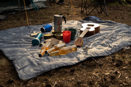 Food and drink on rug in campsite in summer forest