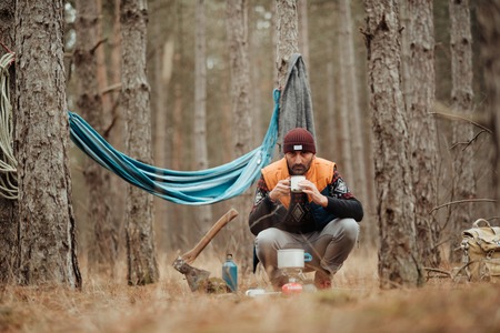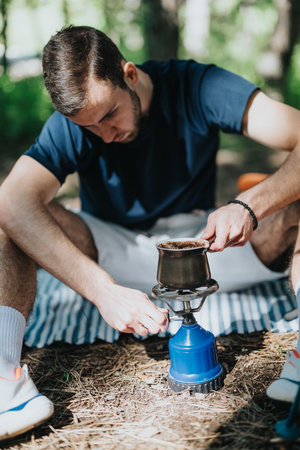 Man brewing coffee outdoors using portable gas stove during camping trip in forest