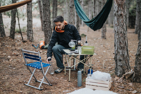 Man Enjoying an Outdoor Picnic Setup in a Forested Area During Leisure Camp Time