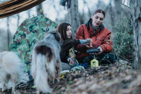 Two women camping in a forest cook on a portable stove while a dog watches