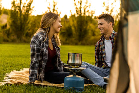 Shot of a happy couple camping on the nature and cooking