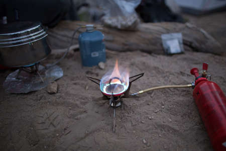 Cooking with gas stove in camping site. Selective focus on gas burner, pot and smoke from boiling water. Tent in the background out of focus. Outdoor activities.