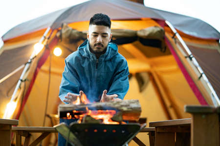 A man enjoying a bonfire in front of tent
