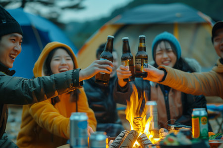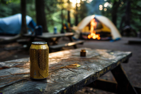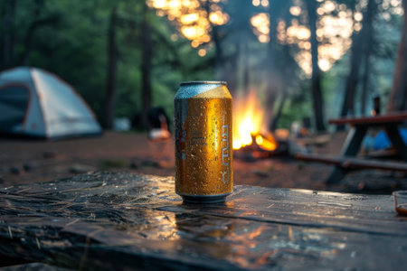 A can of beer is sitting on a table next to a campfire. The can is wet from the condensation, and the fire is casting a warm glow on the scene. Concept of relaxation and enjoyment