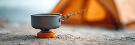 Small pot heating on portable gas stove on sandy beach with blurred orange camping tent in background, creating a serene and adventurous summer travel atmosphere