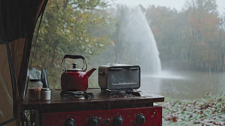close-up of a camping stove with cooking utensils, created with generative ai