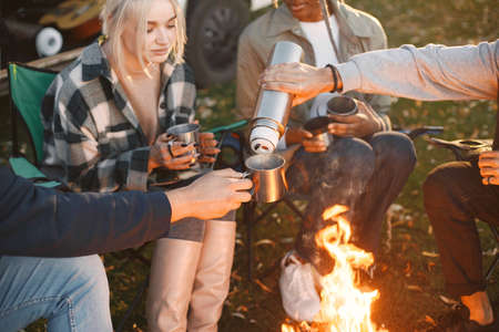 Herbal tea in a metal mug in hand over a portable gas stove. A man's hand holds herbal tea made from rose hips and various herbs in a stainless steel cup. Hiking tourism concept. Selective focus.
