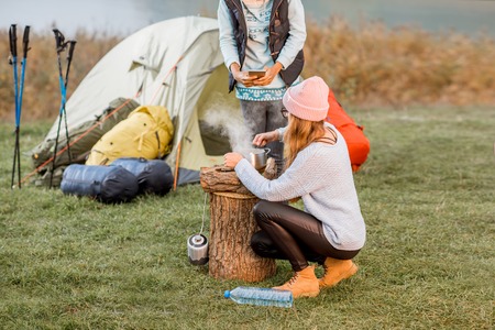 Couple enjoying beautiful mountain landscape in camping, focus on burner and moka pot