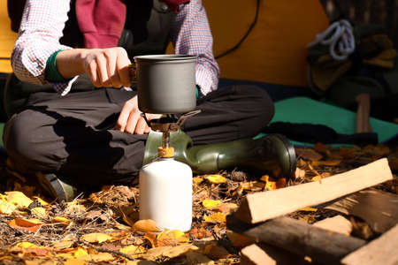 person cooking in nature camping outdoor, cooker prepare breakfast picnic on metal gas stove, hot tea outside; campsite lifestyle