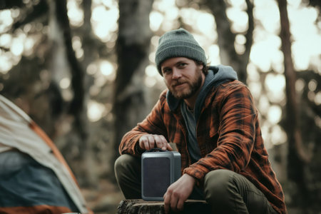 Bearded camper listening to music from his portable speaker while sitting on a tree stump near his tent in a forest