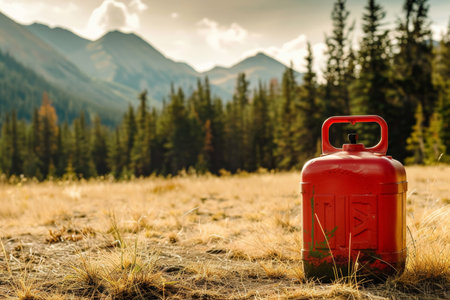 Red gas canister on riverbank with mountainous background. Adventure theme.