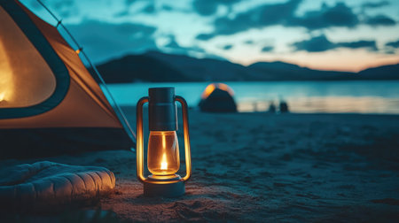 Camping on the shore of a mountain lake in the evening.