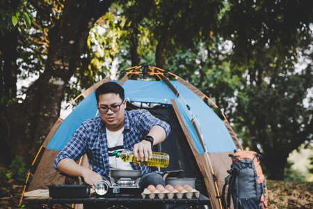 Group of Asian friends eating and camping in the forest.