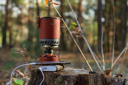Charge your smartphone while traveling with the Powerbank. The portable charger charges your phone with a camping gas burner in the background.
