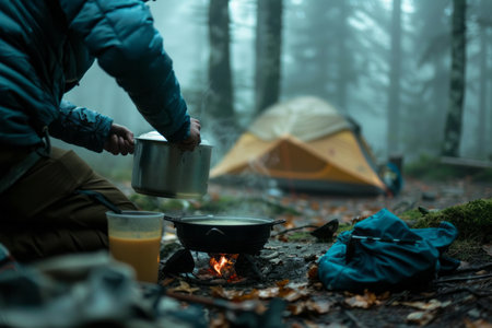 A person cooking in a pot on a portable stove in a forest setting, with camping gear around and a tent in the background. AI generative