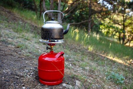 Touristic camping burner installed on gas cylinder tank in background of summer forest. Compact kitchen stove for cooking hot food in field travel conditions. Adventure Park