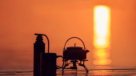 Unrecognizable person heating water in a kettle with a travel stove on the bank of a stream, at sunrise, to make coffee. El Palmar National Park, Entre Rios, Argentina.