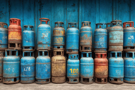 Stacked blue gas cylinders in a storage area, highlighting their worn textures and industrial setting, creating a sense of utility and functionality