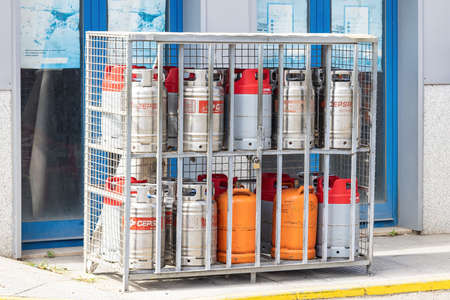 Huelva, Spain - March 10, 2022: Cepsa and Repsol gas cylinders for sale at a Service station