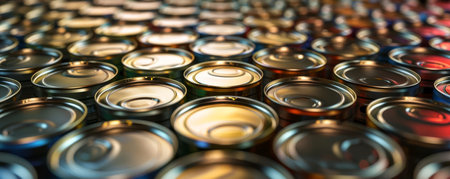 Highpolish tin cans arranged in a grid pattern, the metallic surfaces glinting under bright lighting